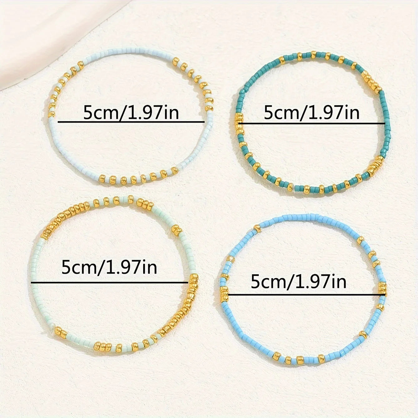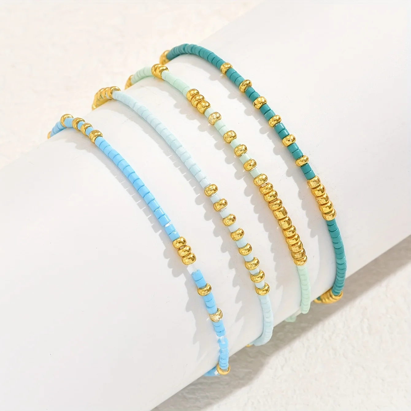 Stilig sett med 4 bohemske armbånd i turkis og gull. Perfekt for stranden eller hverdagen.