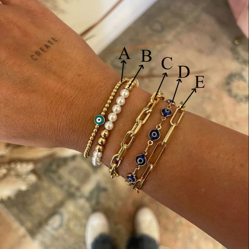 Beskyttende armbåndsett i 18K gullbelagt design. Justerbar kjede og perledetaljer gjør dette settet perfekt for stabling. Et vakkert og spirituelt smykke som passer til enhver anledning.