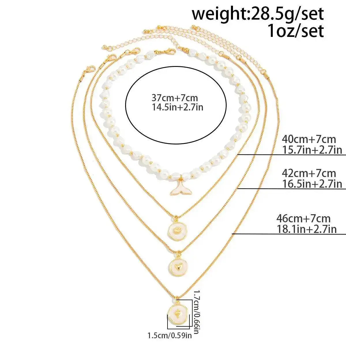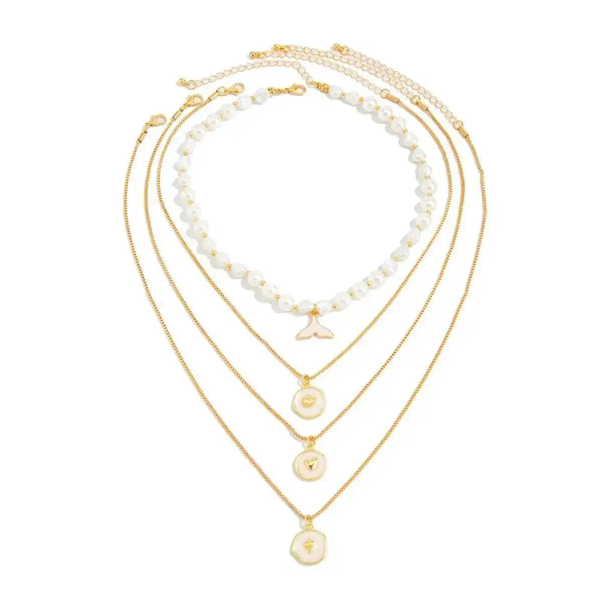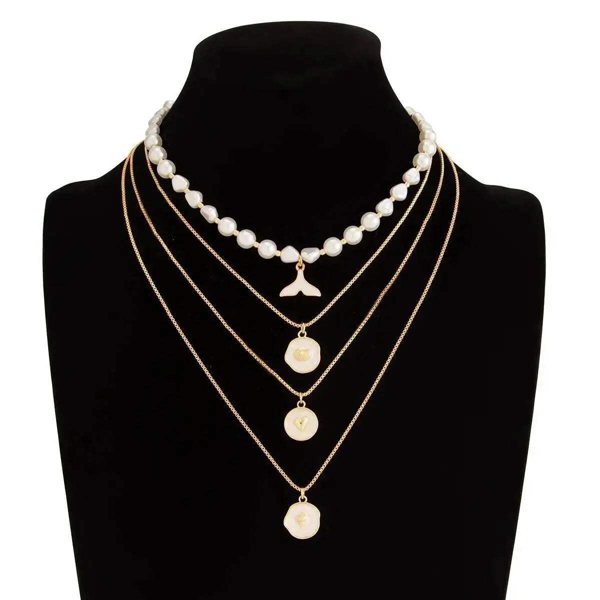 Elegant sett med 4 halskjeder med perler og fiskehaleheng. Flerlags design som kan brukes sammen eller hver for seg.